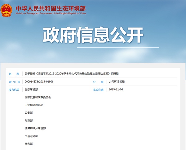 2019年11月6日,生態環境部聯合國家發展和改革委員會、工業和信息化部、公安部、財政部、住房和城鄉建設部等發布關于印發《汾渭平原2019-2020年秋冬季大氣污染綜合治理攻堅行動方案》的通知,詳情如下: