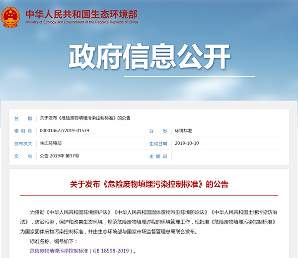 生態環境部關于發布《危險廢物填埋污染控制標準》的公告