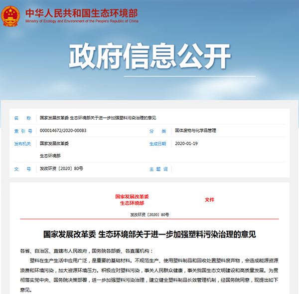 2020年1月19日,國家發(fā)展改革委、生態(tài)環(huán)境部聯(lián)合印發(fā)了《關(guān)于進(jìn)一步加強(qiáng)塑料污染治理的意見》,詳情如下: