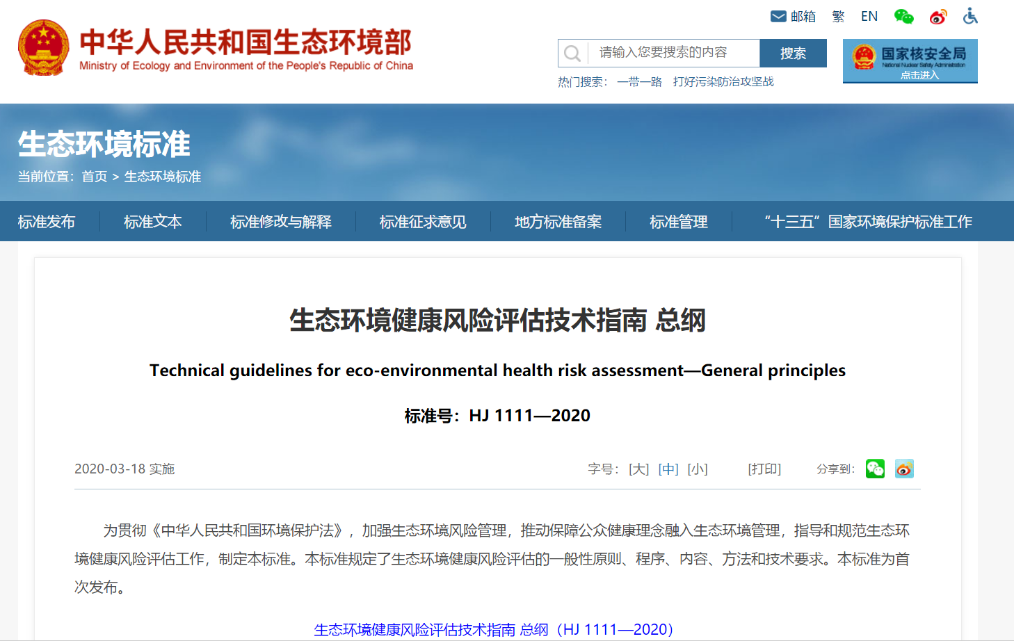 2020年3月18日,生態環境部發布實施《生態環境健康風險評估技術指南 總綱(HJ 1111—2020)》,詳情如下: