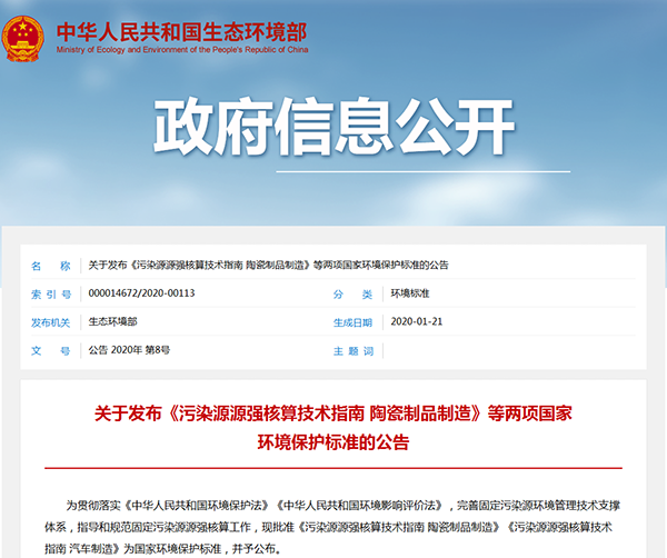 生態(tài)環(huán)境部關(guān)于發(fā)布《污染源源強(qiáng)核算技術(shù)指南 陶瓷制品制造》等兩項(xiàng)國(guó)家環(huán)境保護(hù)標(biāo)準(zhǔn)的公告