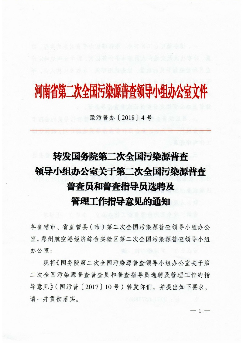 豫污普辦【2018】4號轉發國務院第二次全國污染源普查領導小組辦公室關于第二次全國污染源普查普查員和普查指導員選聘及管理工作指導意見的通知