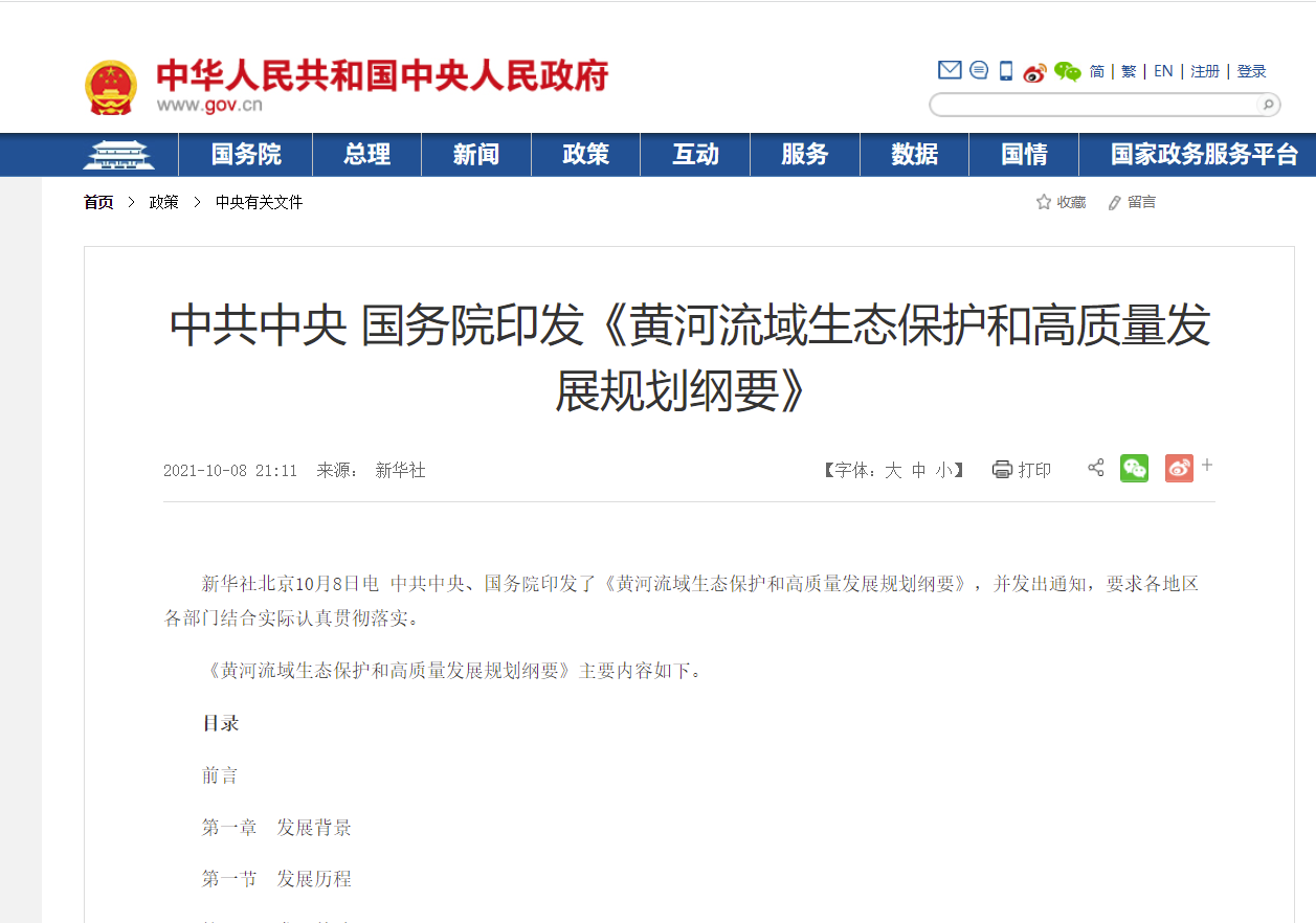 轉(zhuǎn)發(fā)中共中央 國(guó)務(wù)院印發(fā)《黃河流域生態(tài)保護(hù)和高質(zhì)量發(fā)展規(guī)劃綱要》