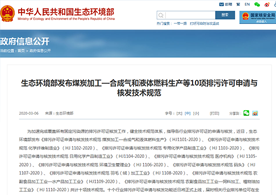 2020年3月6日,生態環境部發布《排污許可證申請與核發技術規范 煤炭加工—合成氣和液體燃料生產》(HJ1101-2020)、《排污許可證申請與核發技術規范 化學纖維制造業》(HJ 1102-2020)