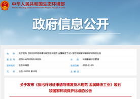 2020年3月9日,生態環境部發布了《排污許可證申請與核發技術規范 金屬鑄造工業》等五項國家環境保護標準